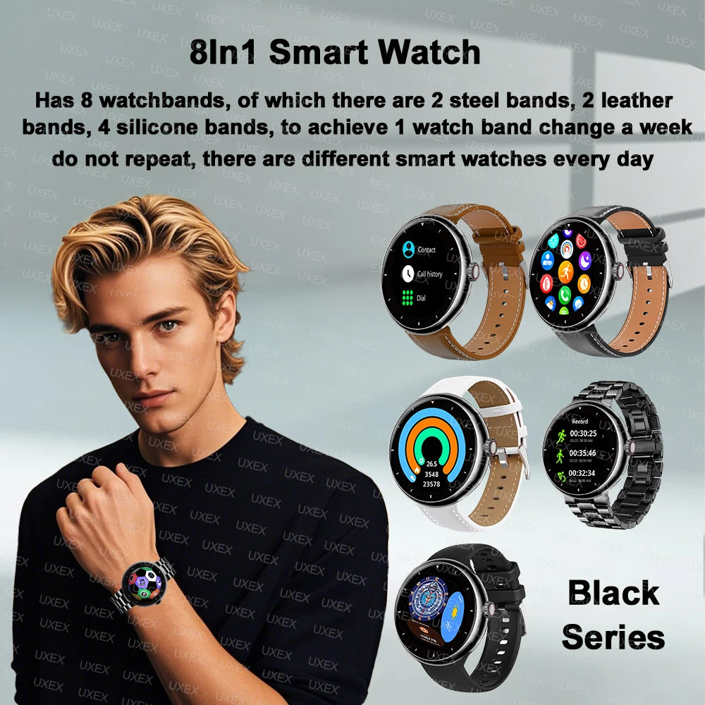 8In1 Smart Watch: Has 8 watchbands, of which there are 2 steel bands, 2 leather bands, 4 silicone bands, to achieve 1 watch band change a week, do not repeat, there are different smart watches every day